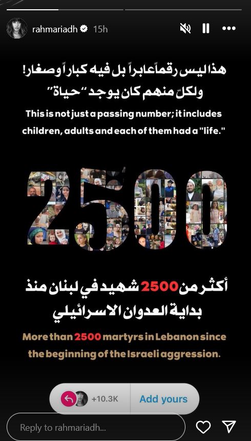 كما جاء في الصورة التي شاركتها رحمة رياض: “أكثر من 2500 شهيد في لبنان منذ بداية العدوان الاسرائيلي”.