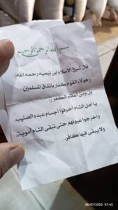 اعلن المرصد السوري لحقوق الانسان، ان “مدينة صافيتا في ريف طرطوس شهدت حالة من التوتر والقلق، عقب العثور على منشورات تحمل مضامين طائفية وتحريضية ضد أبناء الديانة المسيحية، وقد وُجدت ملصقة على جدران عدد من الكنائس والمحال التجارية داخل المدينة”.