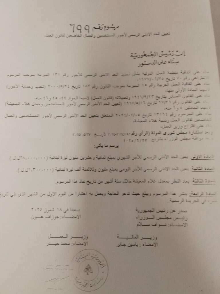 وقّع رئيس الجمهورية العماد جوزاف عون على مرسوم تحديد الحد الأدنى الرسمي للأجور في القطاع الخاص.