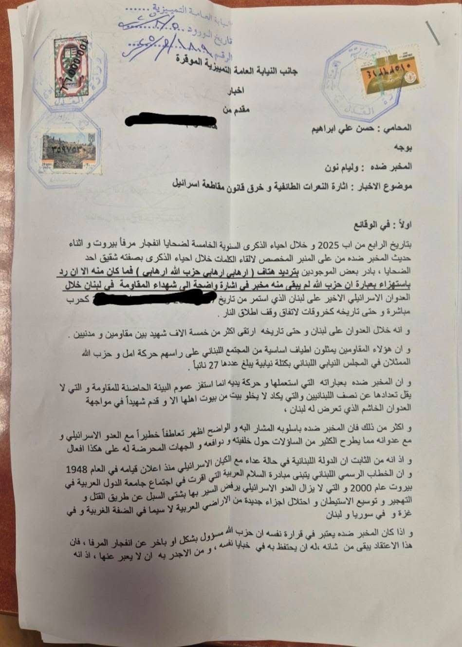 أفادت المعلومات أن عقب الكلمة التي ألقاها وليم نون في الذكرى الخامسة لإنفجار المرفأ تقدم المحامي حسن ابراهيم بإخبار في وجه ويليام نون بموضوع “إثارة النعرات الطائفية وخرق قانون مقاطعة اسرائيل”.