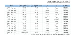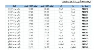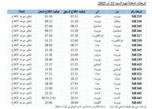 2- تعديل جدول مواعيد عدد من رحلاتها من باريس، نيس، فرانكفورت، ميلانو، روما، اثينا، اسطنبول، لارنكا، دبي، أبوظبي، الرياض، جدة، الدمام، الكويت، الدوحة، بغداد، والنجف وإليها للفترة الممتدة من يوم الجمعة 22 آب 2025 ولغاية يوم الأثنين 25 آب 2025. يشمل هذا التعديل تبكير أو تأخير مواعيد بعض الرحلات، لتصبح وفقًا للتالي: