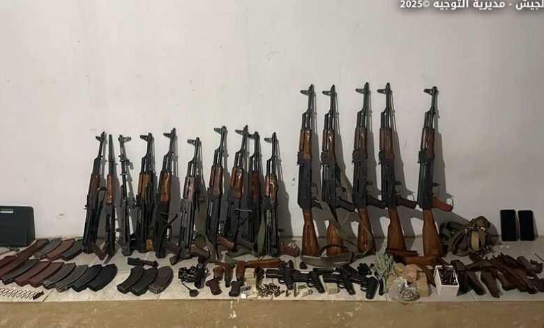 توقيف المواطن (ع.ا.) المطلوب بجرم الاتجار بالأسلحة في بلدة عرسال – بعلبك، وضبط كمية كبيرة من الأسلحة الخفيفة والمتوسطة والذخائر الحربية، بالإضافة إلى أعتدة عسكرية.