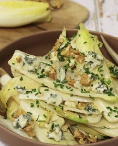 إنها من أطباق السلطة الصالح تناولها عند الغداء أو العشاء. مكوناتها من خضار وفواكه تجعل طعمها لذيذاً، فتولّد نكهة جديدة تمزج بين الحلو والمالح. ونحتاج لتحضيرها إلى 3 حبات من خسّ الأنديف الأجنبي، وتفاحتين، و70 غراماً من حبّات الجوز، و100 غرام من جبن الروكفور الفرنسي. وللصلصة نحتاج إلى 4 ملاعق كبيرة من زيت الزيتون، وملعقة صغيرة من خل التفاح، ومثلها من عصير الليمون الحامض، وأيضاً ملعقة صغيرة من الخردل.