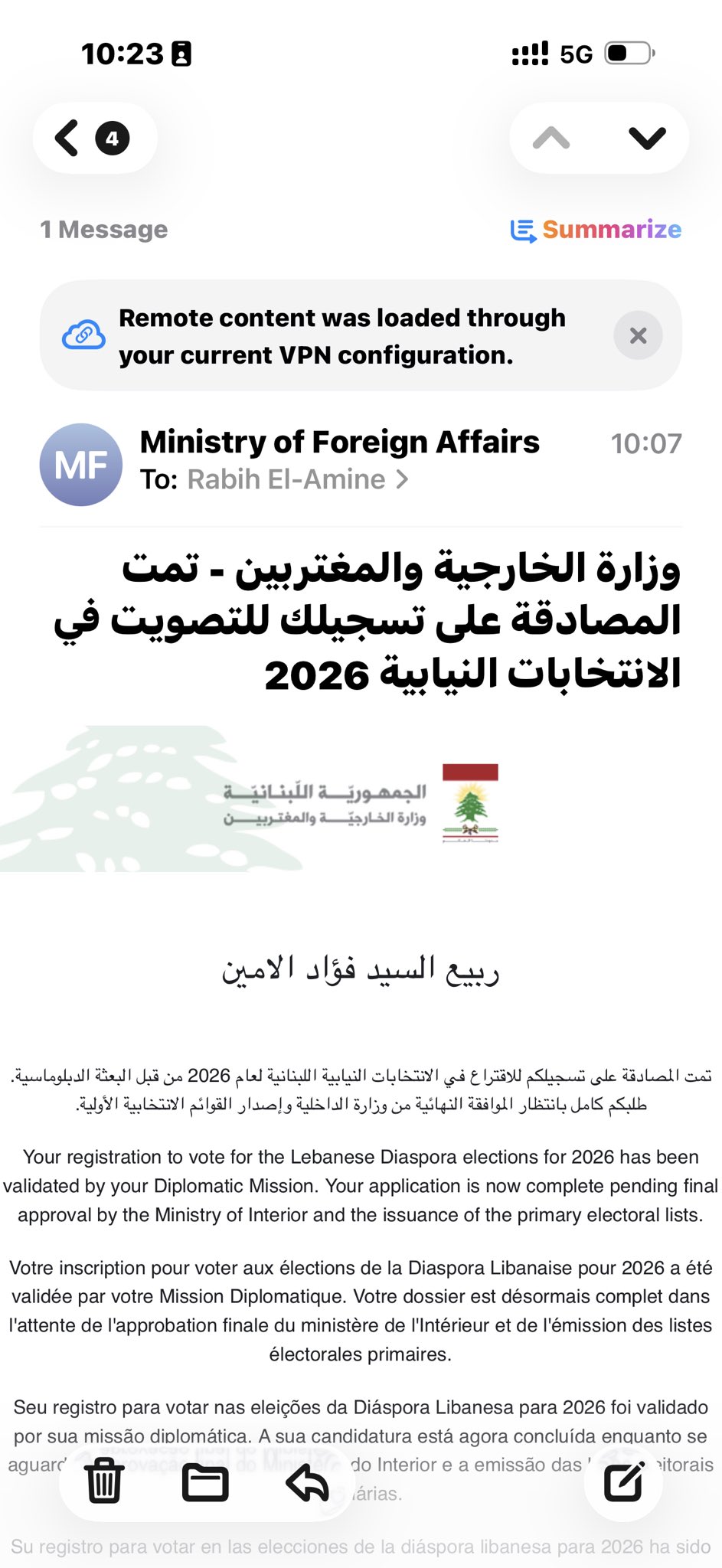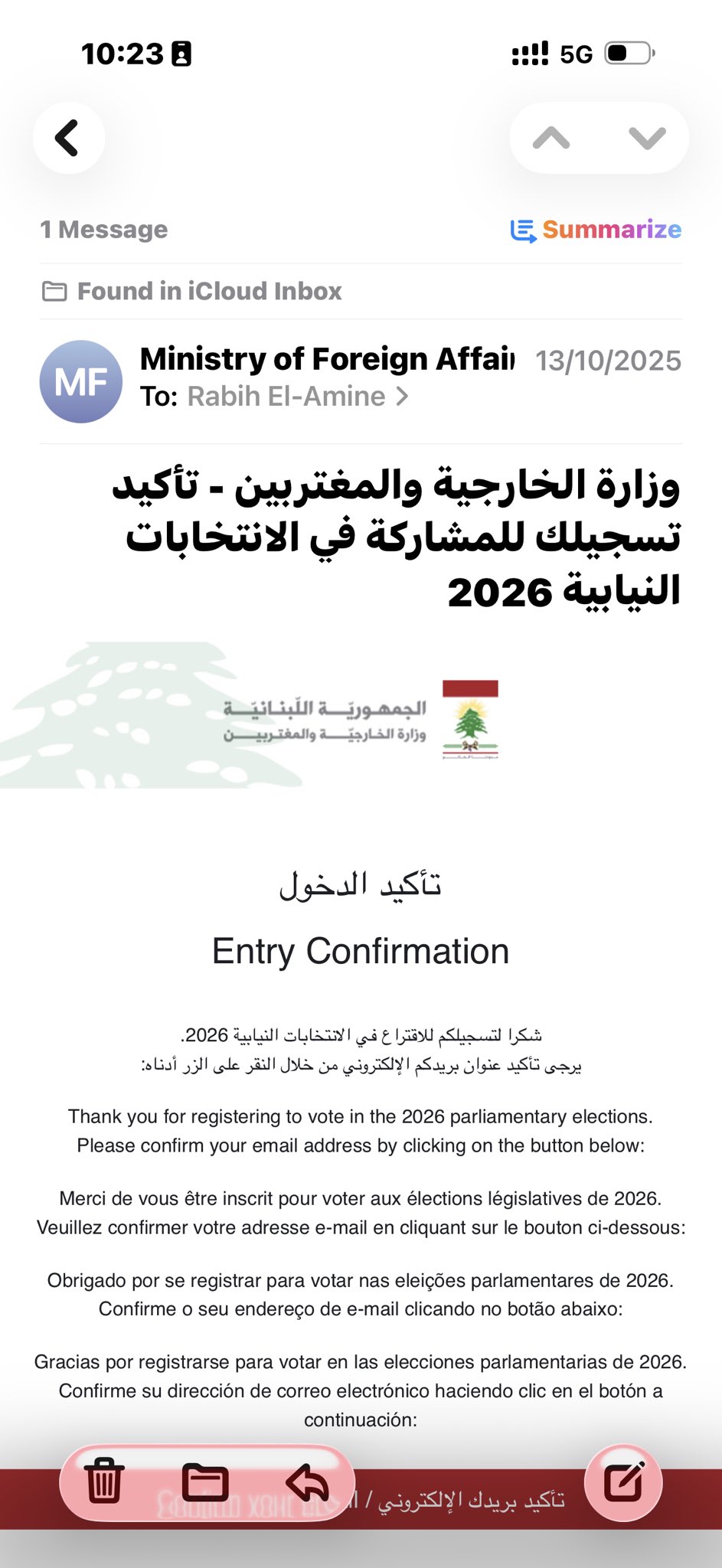 كتب رئيس مجلس إدارة “مجلس التنفيذيين اللبنانيين” ربيع الامين عبر منصة “اكس”: “تسجلت عبر المنصة الإلكترونية لوزارة الخارجية اللبنانية للتصويت من الخارج في 13/10/2025، واليوم وصلني تأكيد التسجيل بعد مرور 20 يومًا.