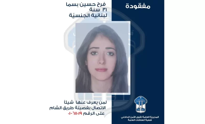 عمّمت المديريّة العامّة لقوى الأمن الدّاخلي، بناءً على إشارة القضاء المختص، صورة المدعوة: فرح حسين بسما (مواليد عام 1995، لبنانية) التي فقدت منذ حوالي الشهرين في محلة الطيونة.