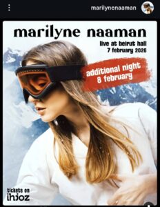 أعلنت الفنانة الشابة ماريلين نعمان عن إضافة ليلة ثانية لحفلها الغنائي المرتقب في شهر شباط، بعد نفاد جميع بطاقات ليلة 7 شباط. وسيقام الحفل الجديد في 8 شباط في Beirut Hall، ما يتيح لعشاقها فرصة إضافية للاستمتاع بأدائها.