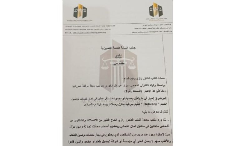 تقدم عضو تكتل” الجمهورية القوية” النائب رازي الحاج عبر وكيله القانوني المحامي سيزار عبدالله الخوري بإخبار إلى جانب النيابة العامة التمييزية حول ظاهرة عمّال التوصيل “الديليفري” و ما يرافقها من تجاوزات و خرق القانون وصولاً الى حدّ إرتكاب الجرائم و قد سُجلّ تحت الرقم ١٧٨/٢٠٢٦ وأُحيل الى شعبة المعلومات وذلك لاجراء التحقيقات اللازمة