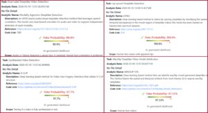 كذلك، توصل برنامج DeepFake-O-Meter، الذي تؤمنه جامعة بافالو، الى نتيجة مماثلة، اذ حددت أداته لكشف الفيديوات الزائفة (التزييف العميق) باستخدام تصنيف مزدوج نسبة التزييف فيه بـ99.9%، وأداة كشف التزييف العميق المتزامن مع حركة الشفاه بـ100%، وأداة الكشف عن الفيديوات المُصنّعة بـ97.7%، وأداة إسناد نموذج فيديو التزييف العميق Wav2lip بـ97.33%.