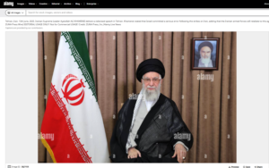 وتتأكد شكوكنا بنتيجة البحث عن المقطع، بتجزئته الى صور ثابتة (Invid)، اذ يضعنا محرك Tineye أمام صورة أصلية مماثلة تماماً، مؤرشفة في موقع آلامي Alamy لتخزين الصور، في 13 حزيران 2025، وتظهر المرشد الاعلى الايراني علي خامنئي، خلال القائه خطاباً متلفزاً في طهران.