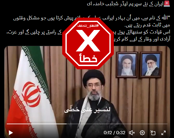 المتداول: فيديو يظهر، وفقاً للمزاعم، “مجتبى خامنئي، نجل المرشد الإيراني الراحل علي خامنئي، موجها أول خطاب له الى الايرانيين كمرشد أعلى”.