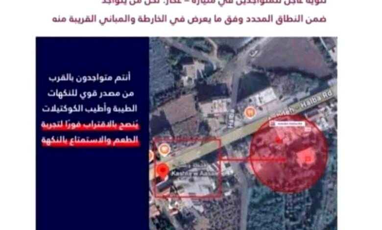 وفي التفاصيل، جاء الإعلان بصيغة تحاكي بشكل مباشر الإنذارات التي يطلقها المتحدث باسم الجيش الإسرائيلي أفيخاي أدرعي، مرفقاً بخريطة وتحديد نطاق جغرافي وعبارات توحي بالخطر، قبل أن يتبيّن لاحقاً أنه مجرّد ترويج تجاري لمحل يقدّم الحلويات والمشروبات. هذا الأسلوب، الذي وُصف بالمستفز وغير الأخلاقي، أثار حالة من الذعر لدى المواطنين، خصوصاً في ظل التوتر الأمني القائم والخشية من أي تصعيد مفاجئ.