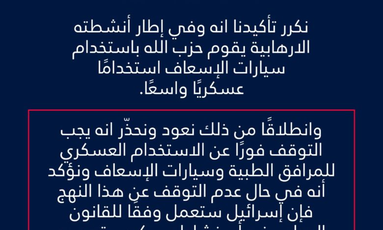 الجيش الاسرائيلي: نحذر من استخدام حزب الله سيارات الإسعاف لأغراض عسكرية ونؤكد أننا سنتحرك وفق القانون الدولي ضد أي نشاط يتم عبرها