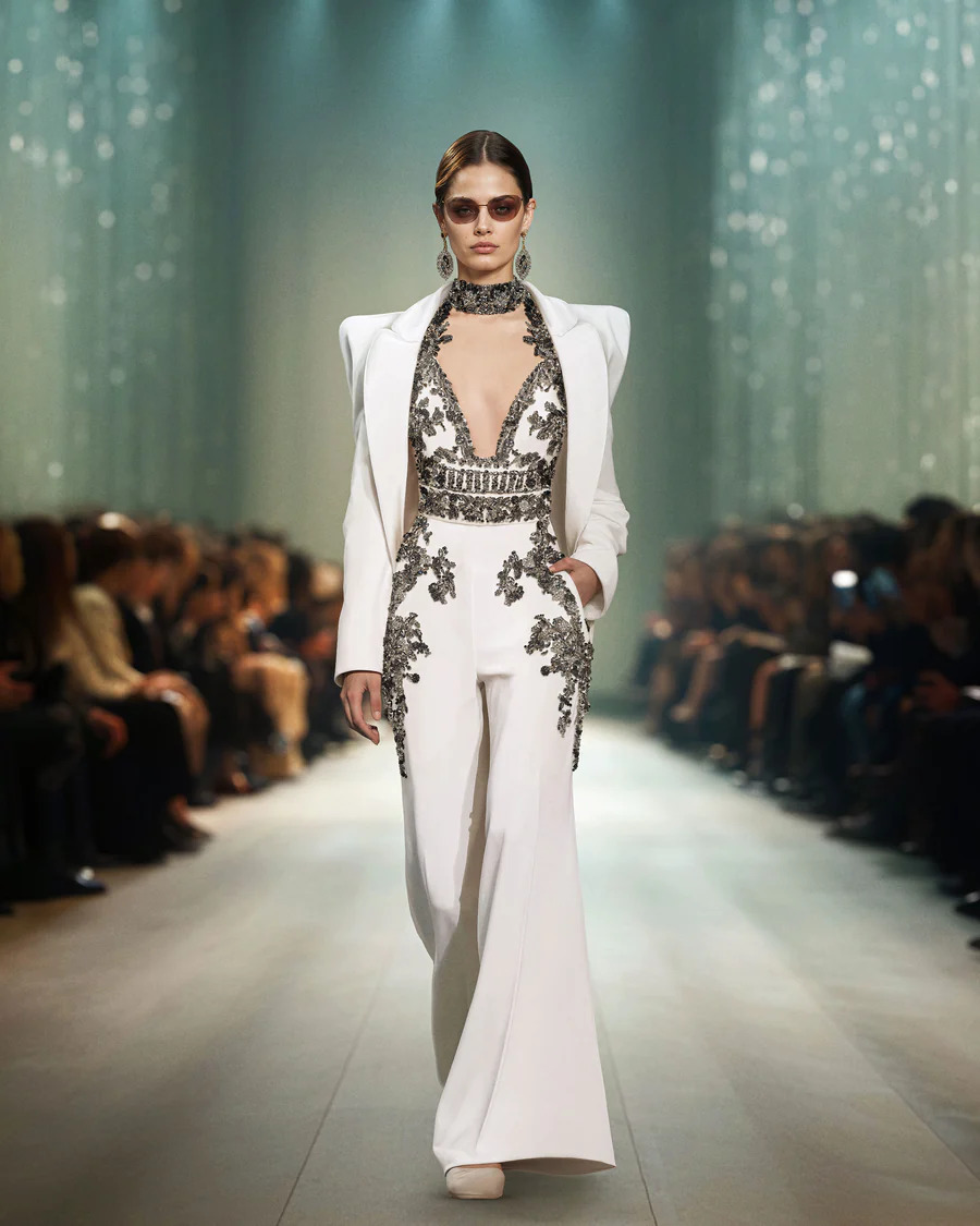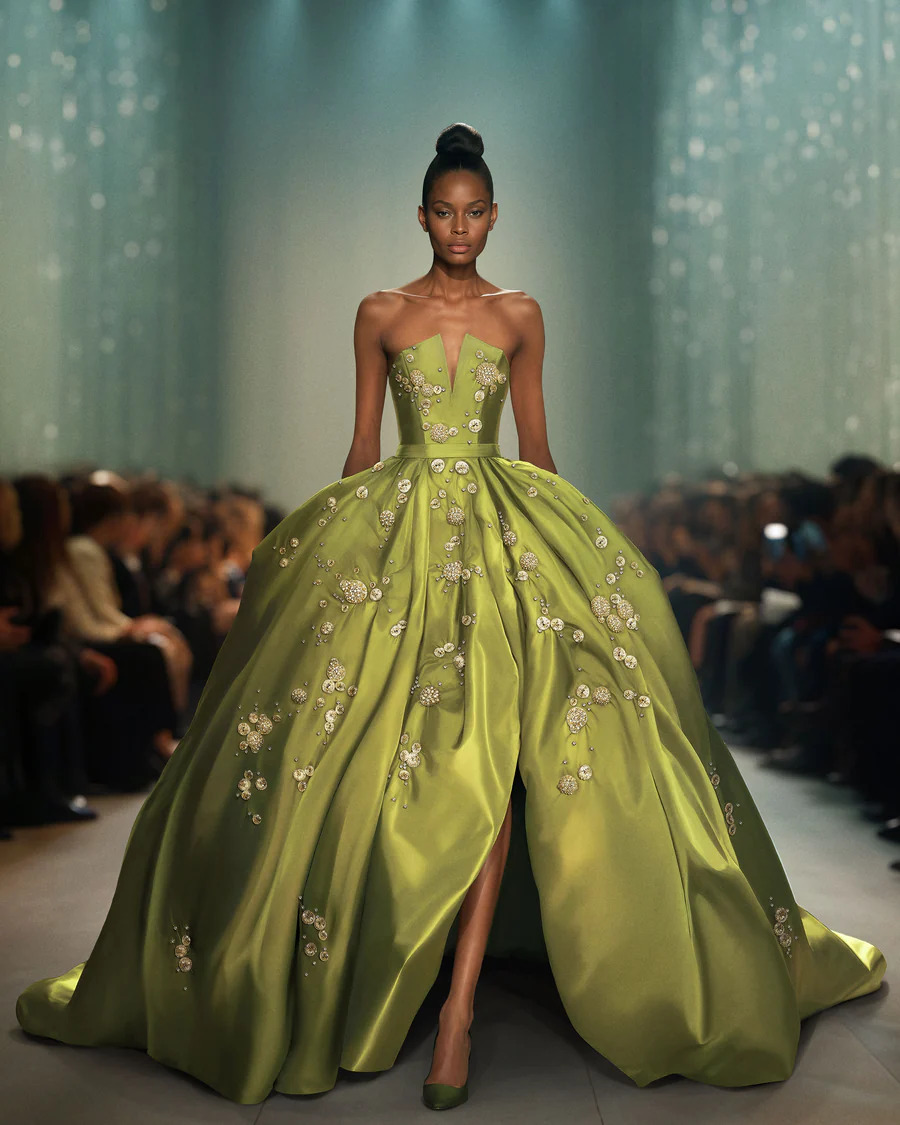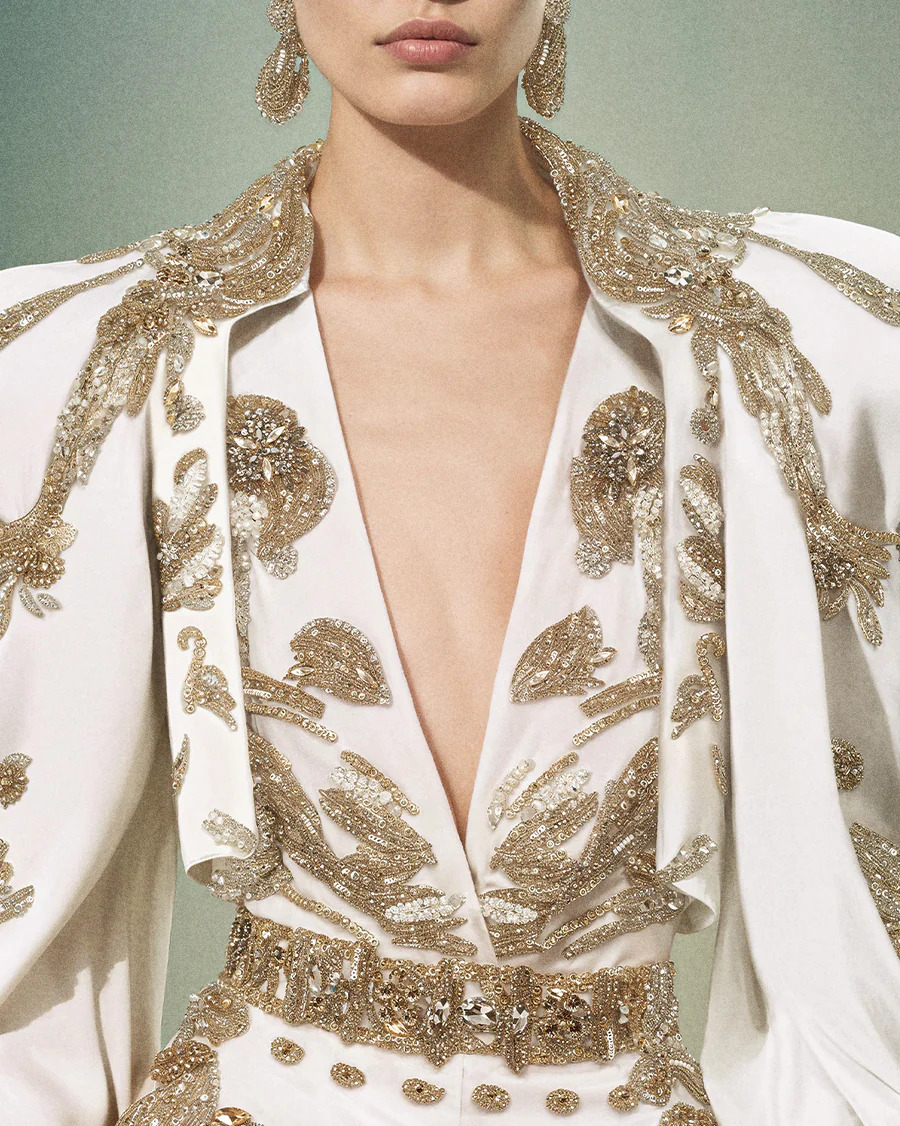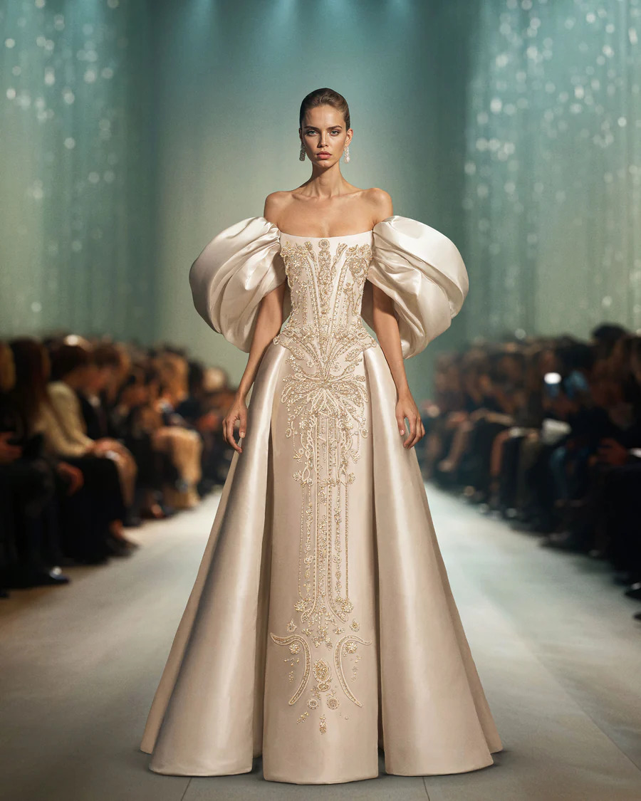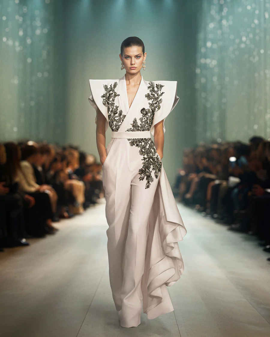 فستان مع كورسيه… تنورة واسعة…. خصر ظاهر…. طابع ماري أنطوانيت غلب على #مجموعة سعيد قبيسي كوتور ل#ربيع وصيف 2024 التي أطلق عليه عنوان “سيمفونيّة الألوان” والتي تميّزت بالإبداع الساحر والرائع. وإلى جانب تلك القصّات الأميريّة المذهلة برزت فساتين تتميّز بأحجام وقصّات هندسيّة كالجمبسوت الأبيض المطرّز مع مشلح خلفي، ولفت نظرنا الأوفر أول مع سترة بيضاء ذي الأكتاف العريضة وكذلك الفستان الأسود من التافتا الذي يتميّز بالكورسيه المطرّز المفتوح على الصدر مع الأكمام المنفوخة على الأكتاف. قطع مبتكرة رائعة تحاكي أنوثة المرأة نفّذت بأقمشة التافتا والساتان والكريب.
