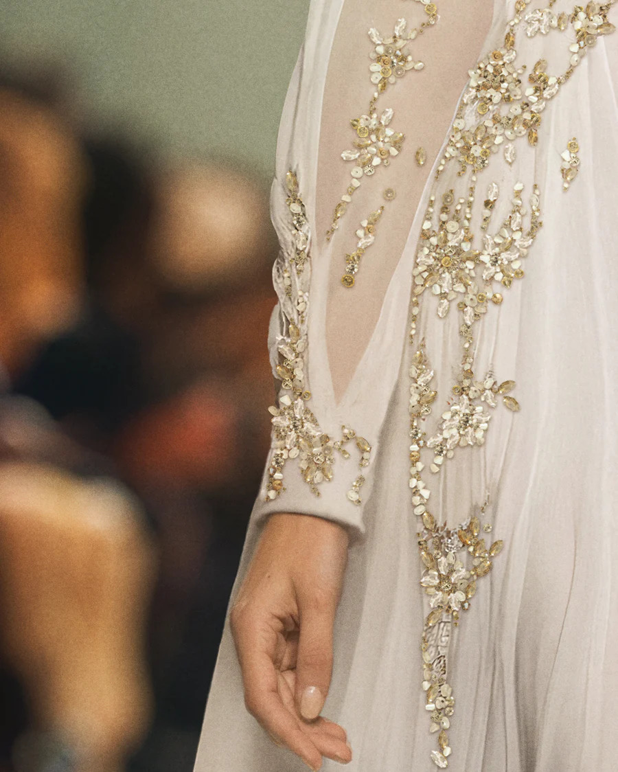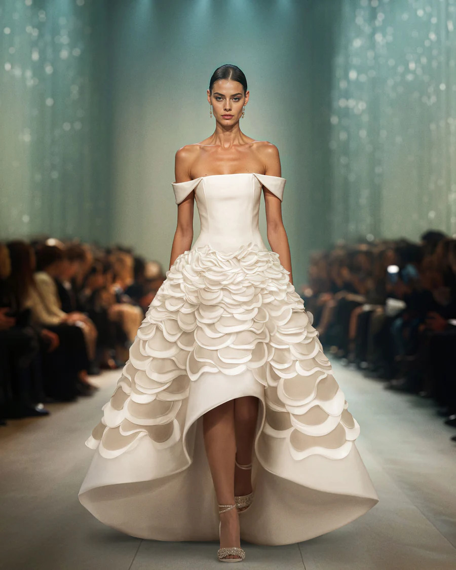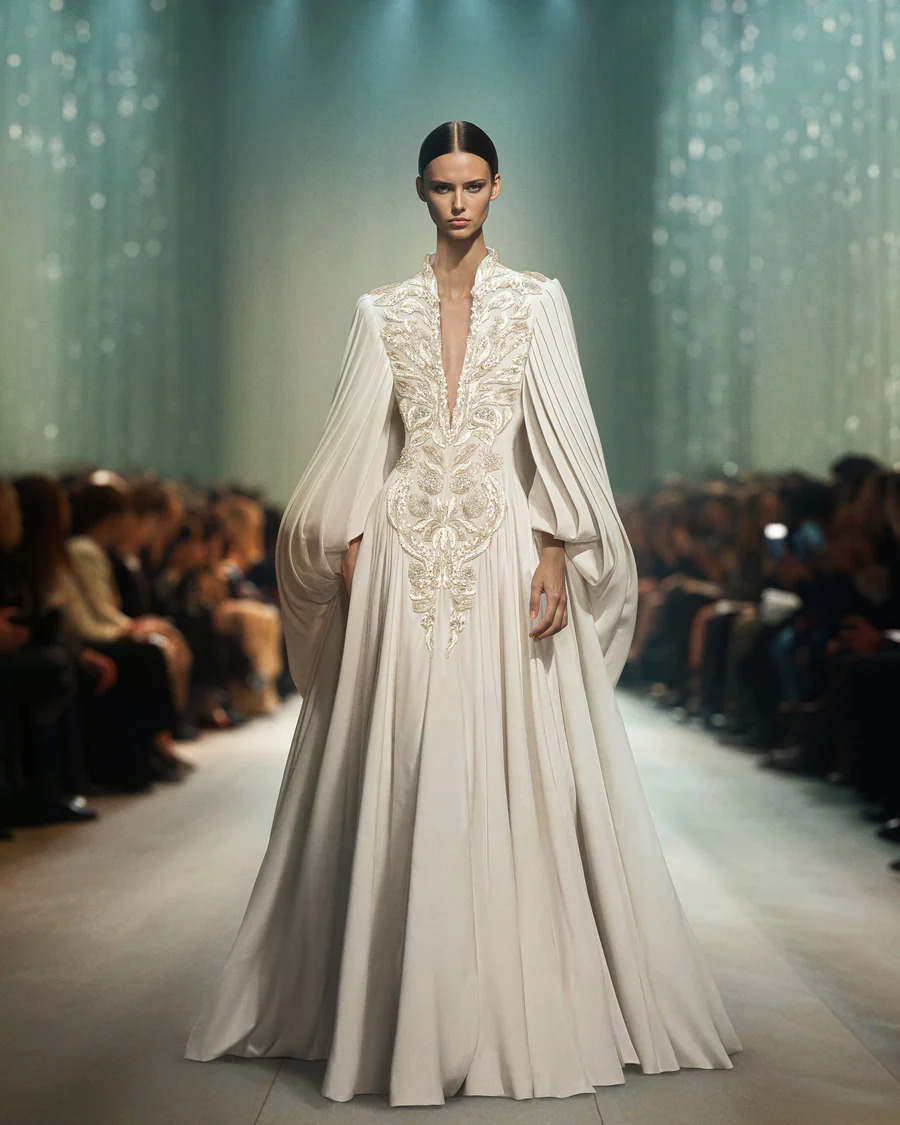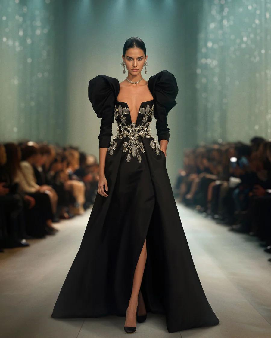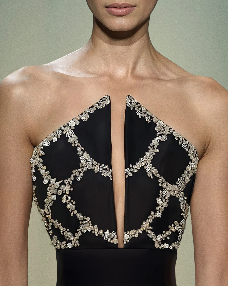 فستان مع كورسيه… تنورة واسعة…. خصر ظاهر…. طابع ماري أنطوانيت غلب على #مجموعة سعيد قبيسي كوتور ل#ربيع وصيف 2024 التي أطلق عليه عنوان “سيمفونيّة الألوان” والتي تميّزت بالإبداع الساحر والرائع. وإلى جانب تلك القصّات الأميريّة المذهلة برزت فساتين تتميّز بأحجام وقصّات هندسيّة كالجمبسوت الأبيض المطرّز مع مشلح خلفي، ولفت نظرنا الأوفر أول مع سترة بيضاء ذي الأكتاف العريضة وكذلك الفستان الأسود من التافتا الذي يتميّز بالكورسيه المطرّز المفتوح على الصدر مع الأكمام المنفوخة على الأكتاف. قطع مبتكرة رائعة تحاكي أنوثة المرأة نفّذت بأقمشة التافتا والساتان والكريب.