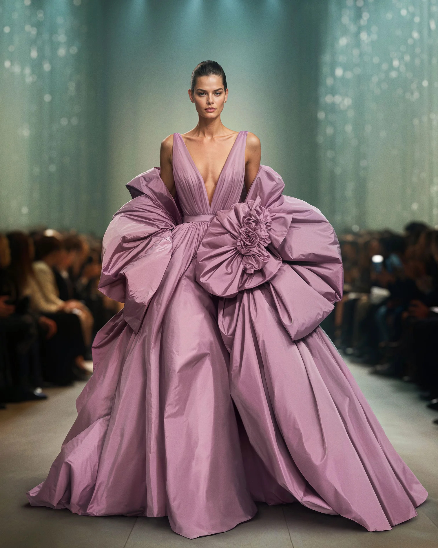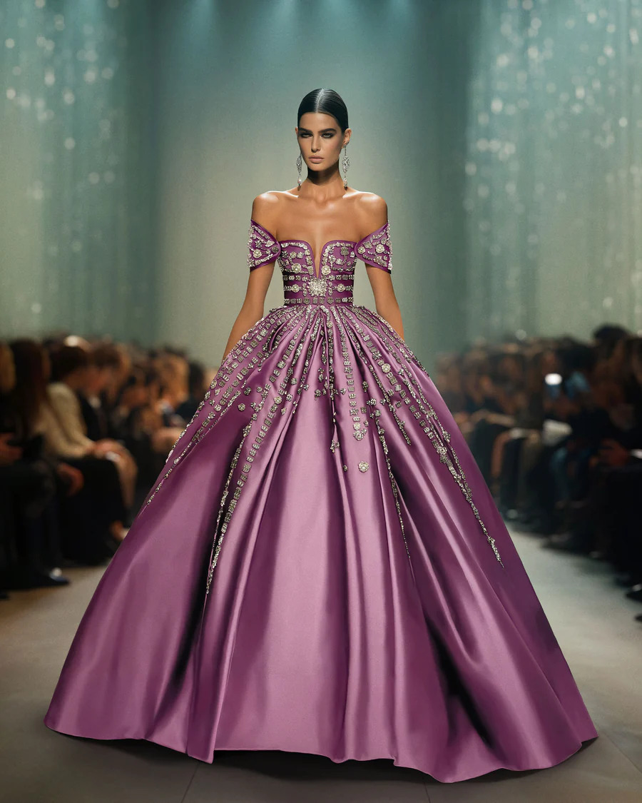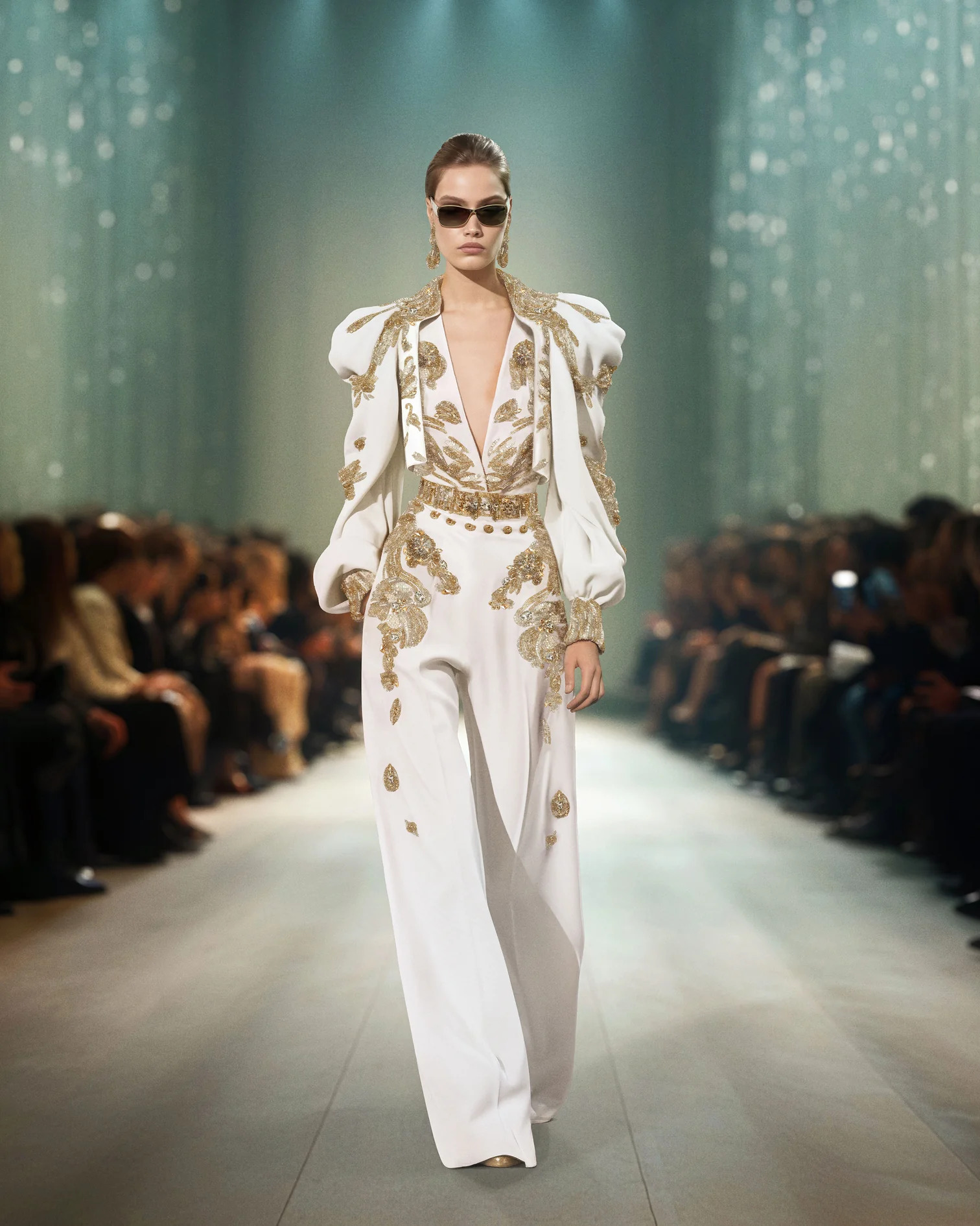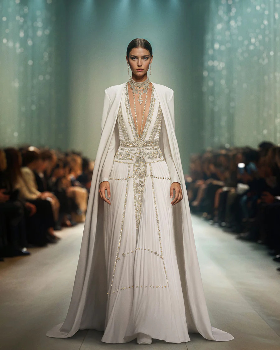 فستان مع كورسيه… تنورة واسعة…. خصر ظاهر…. طابع ماري أنطوانيت غلب على #مجموعة سعيد قبيسي كوتور ل#ربيع وصيف 2024 التي أطلق عليه عنوان “سيمفونيّة الألوان” والتي تميّزت بالإبداع الساحر والرائع. وإلى جانب تلك القصّات الأميريّة المذهلة برزت فساتين تتميّز بأحجام وقصّات هندسيّة كالجمبسوت الأبيض المطرّز مع مشلح خلفي، ولفت نظرنا الأوفر أول مع سترة بيضاء ذي الأكتاف العريضة وكذلك الفستان الأسود من التافتا الذي يتميّز بالكورسيه المطرّز المفتوح على الصدر مع الأكمام المنفوخة على الأكتاف. قطع مبتكرة رائعة تحاكي أنوثة المرأة نفّذت بأقمشة التافتا والساتان والكريب.