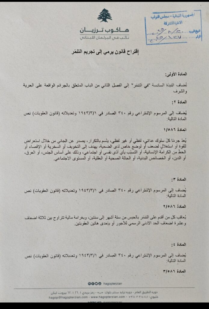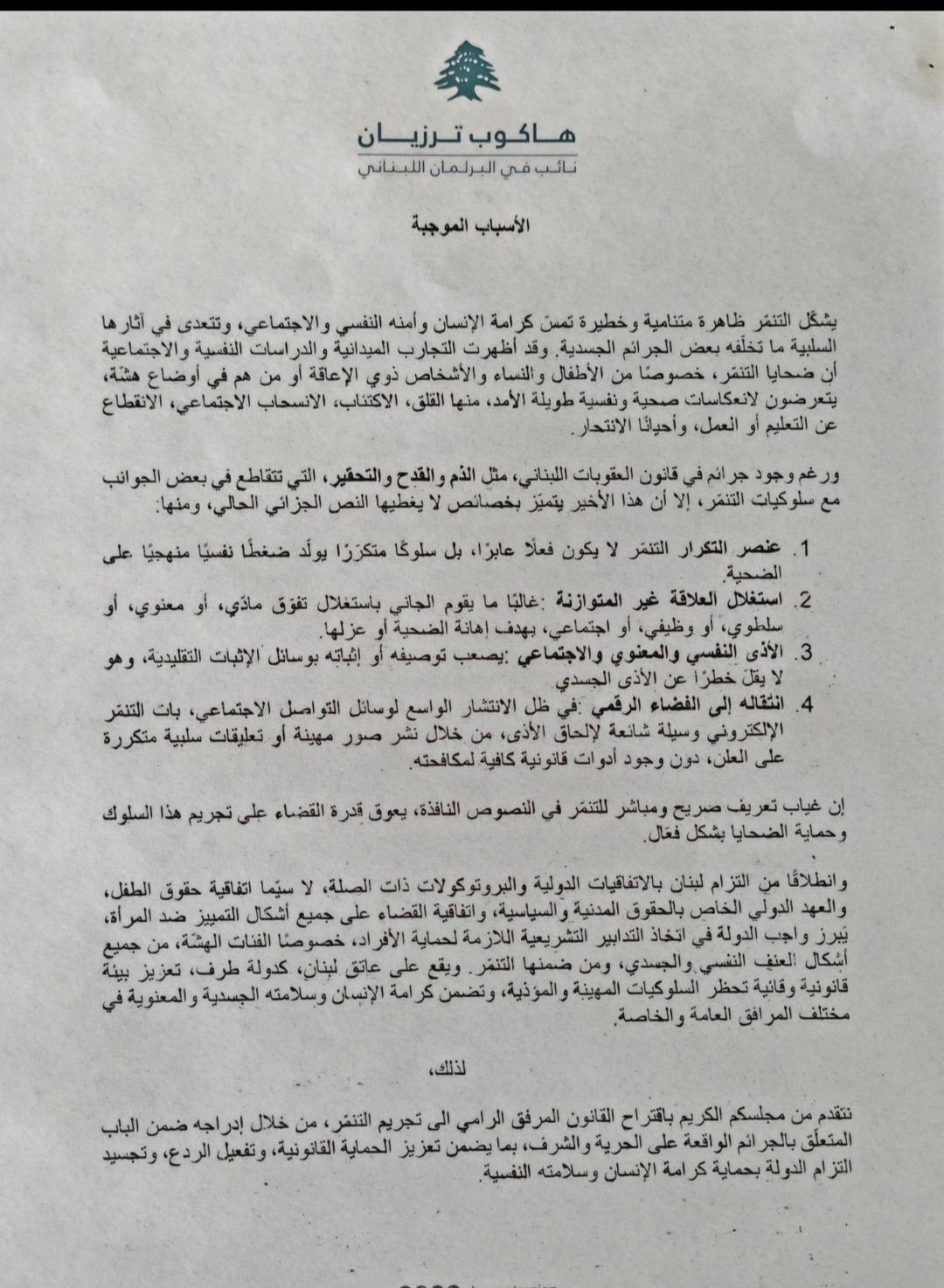 ترزيان يتقدم باقتراح قانون لتجريم التنمّر