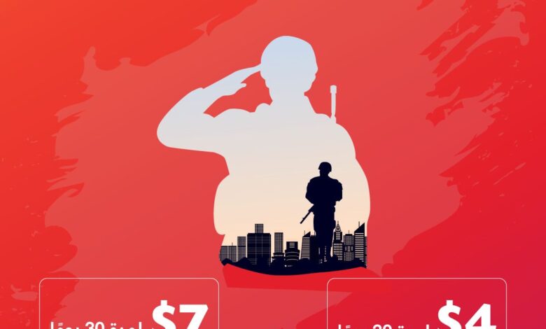 – برنامج الخط العسكري المسبق الدفع ب 7 دولارات شهريا يتضمن: 10GB، و240 دقيقة تخابر، و500 رسالة قصيرة.
